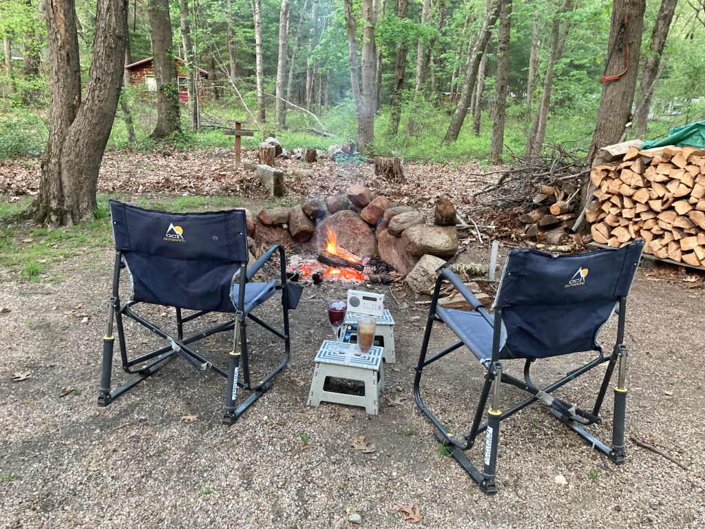 Campfires! Whether with friends or just us two, we love to sit around a campfire at night. S’mores of different varieties are on the menu, of course! And if just us two, we might be listening to a baseball game on the radio.