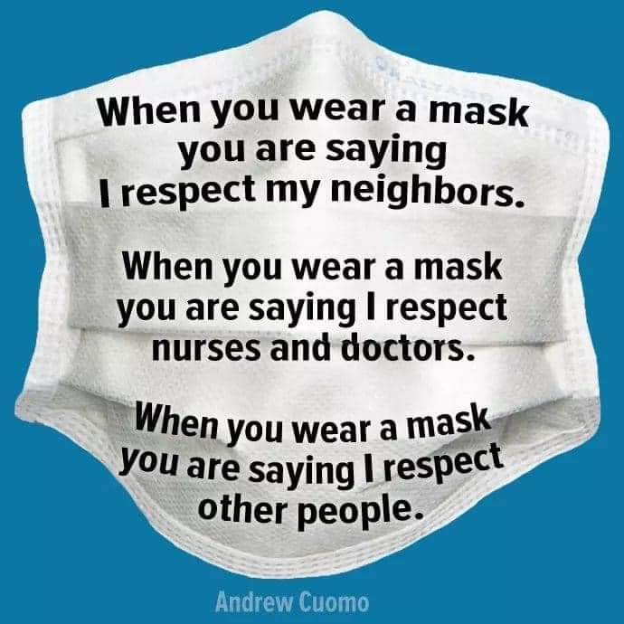 My friends and family, I know that some of you do not believe that COVID19 is for real and/or that the government should do its best to protect its citizens. I can’t honestly say that I understand your view, but I do ask that you please do your best to protect ME, and others – wear a mask! I just do not understand why that is too much to ask! I do not understand why that is deemed a political statement. I see it as a sign of respect and caring. It’s not about YOU! It is about doing what you can do protect everyone around you. And, yes – I know the verdict is still out on exactly how this virus spreads, etc. – but over all, wearing a mask has been seen as a major way to stop the spread. I thank all of you who follow the “wear a mask” advisements.